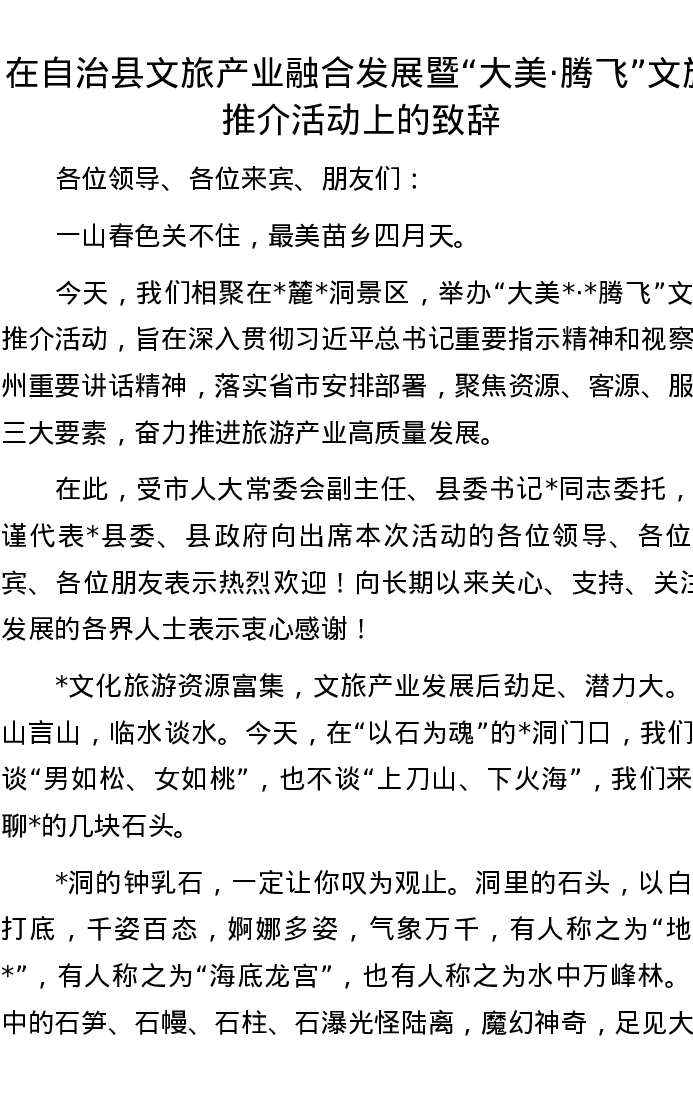 在自治县文旅产业融合发展暨“大美·腾飞”文旅推介活动上的致辞