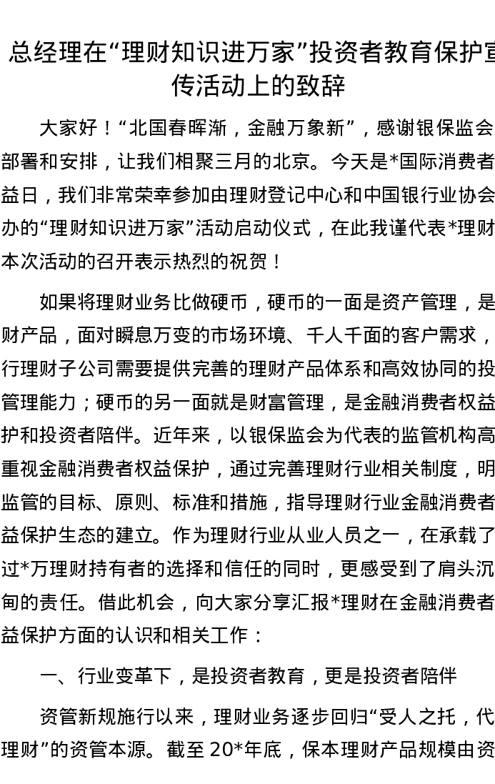 总经理在“理财知识进万家”投资者教育保护宣传活动上的致辞