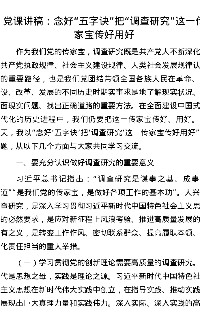 党课讲稿:念好“五字诀” 把“调查研究”这一传家宝传好用好