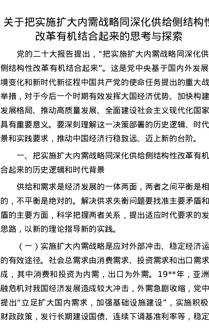 关于把实施扩大内需战略同深化供给侧结构性改革有机结合起来的思考与探索