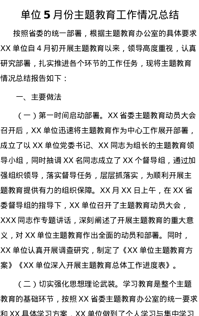 单位5月份主题教育工作情况总结(特色社会主义思想)
