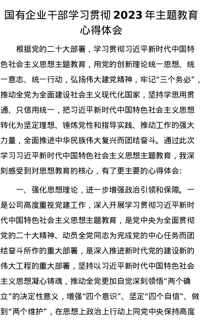 国有企业干部学习贯彻2023年主题教育心得体会(特色社会主义思想)