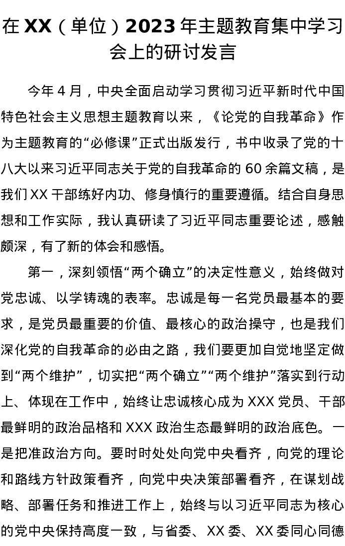 在XX(单位)2023年主题教育集中学习会上的研讨发言(特色社会主义思想)