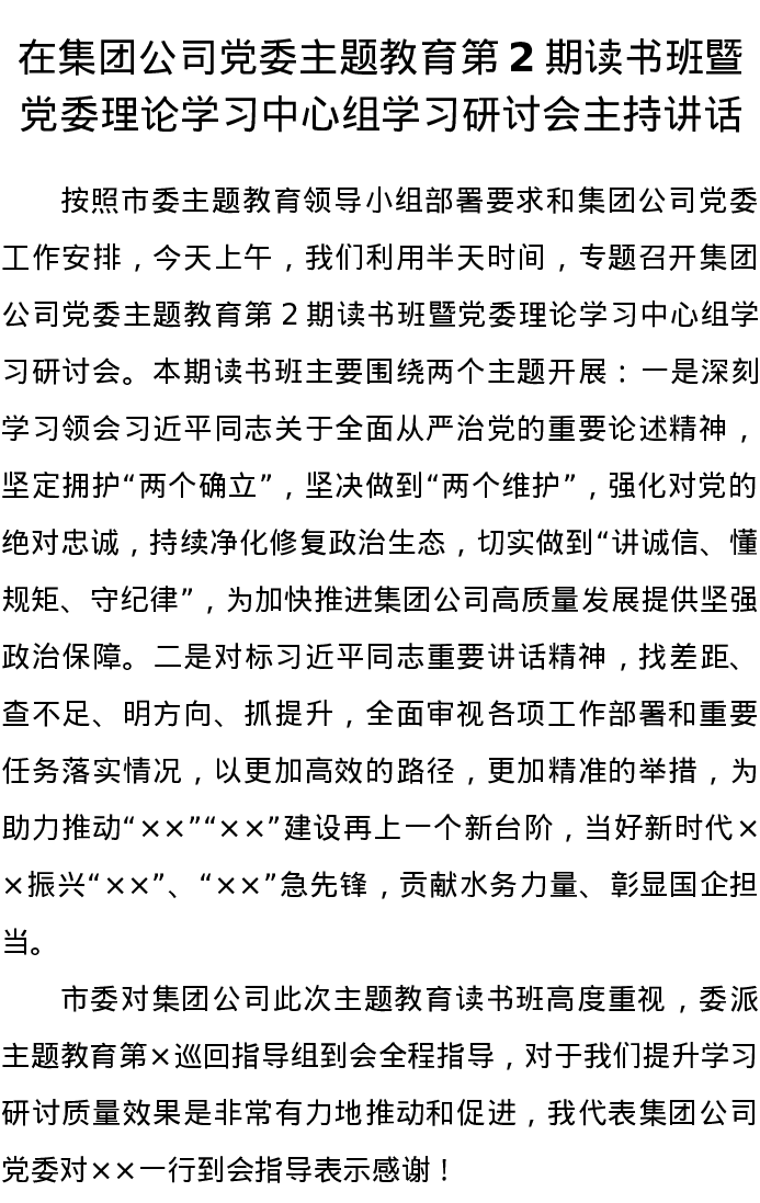 在集团公司党委主题教育第2期读书班暨党委理论学习中心组学习研讨会主持讲话(特色社会主义思想)