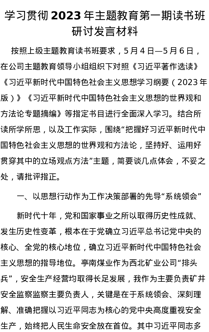 学习贯彻2023年主题教育第一期读书班研讨发言材料(特色社会主义思想)