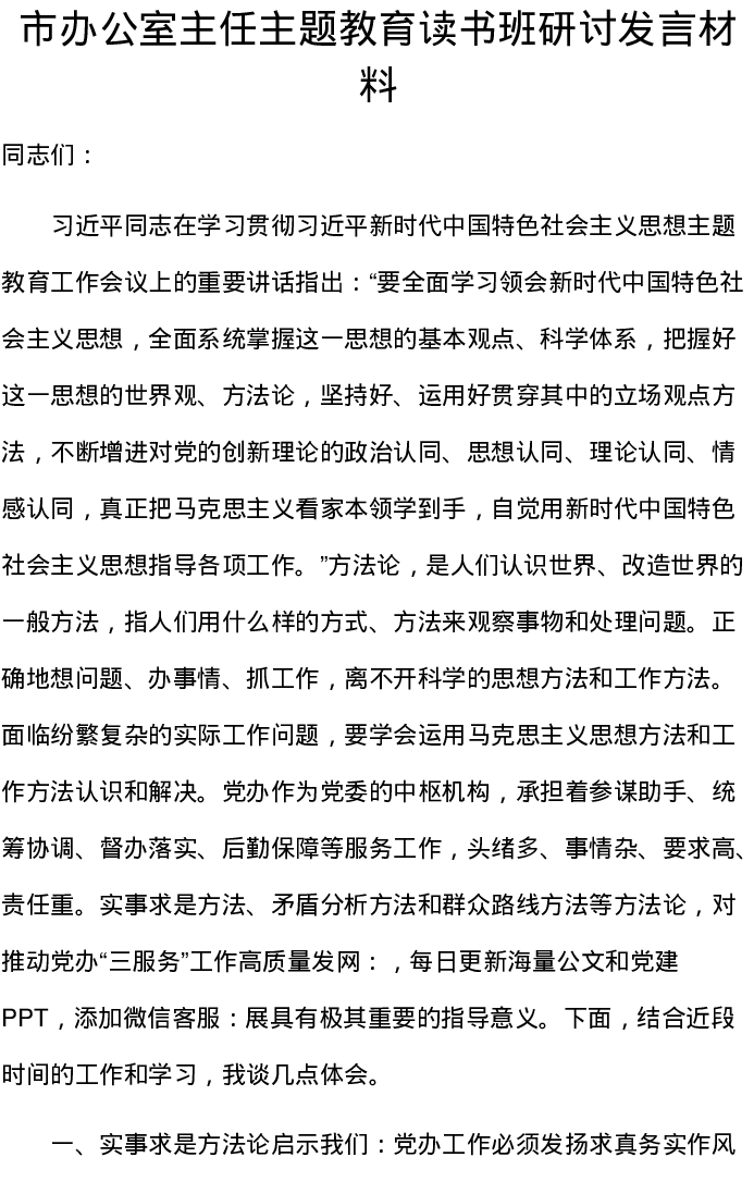 市办公室主任主题教育读书班研讨发言材料(特色社会主义思想)