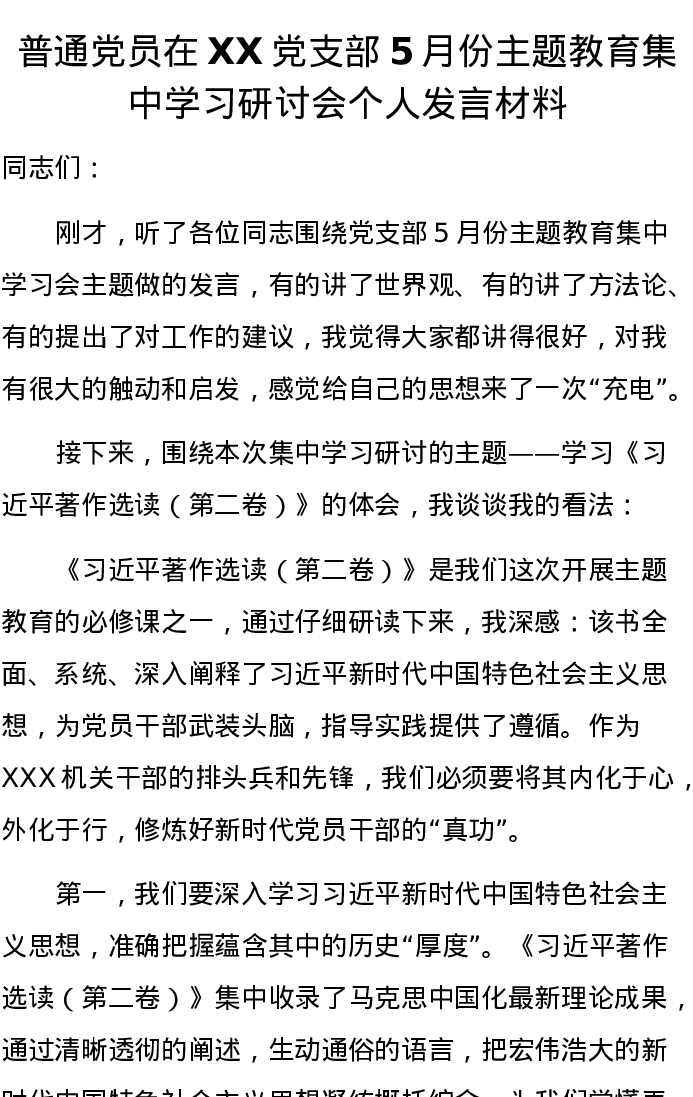 普通党员在XX党支部5月份主题教育集中学习研讨会个人发言材料(特色社会主义思想)