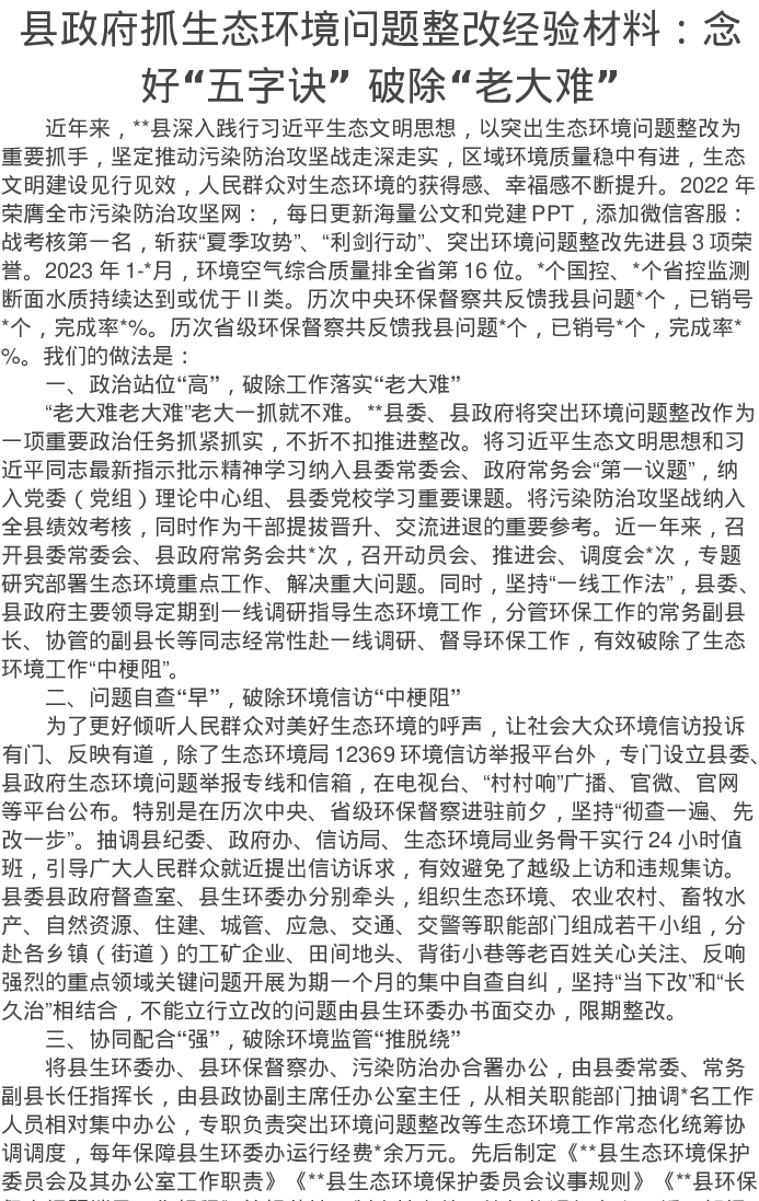 县政府抓生态环境问题整改经验材料念好 五字诀破除老大难