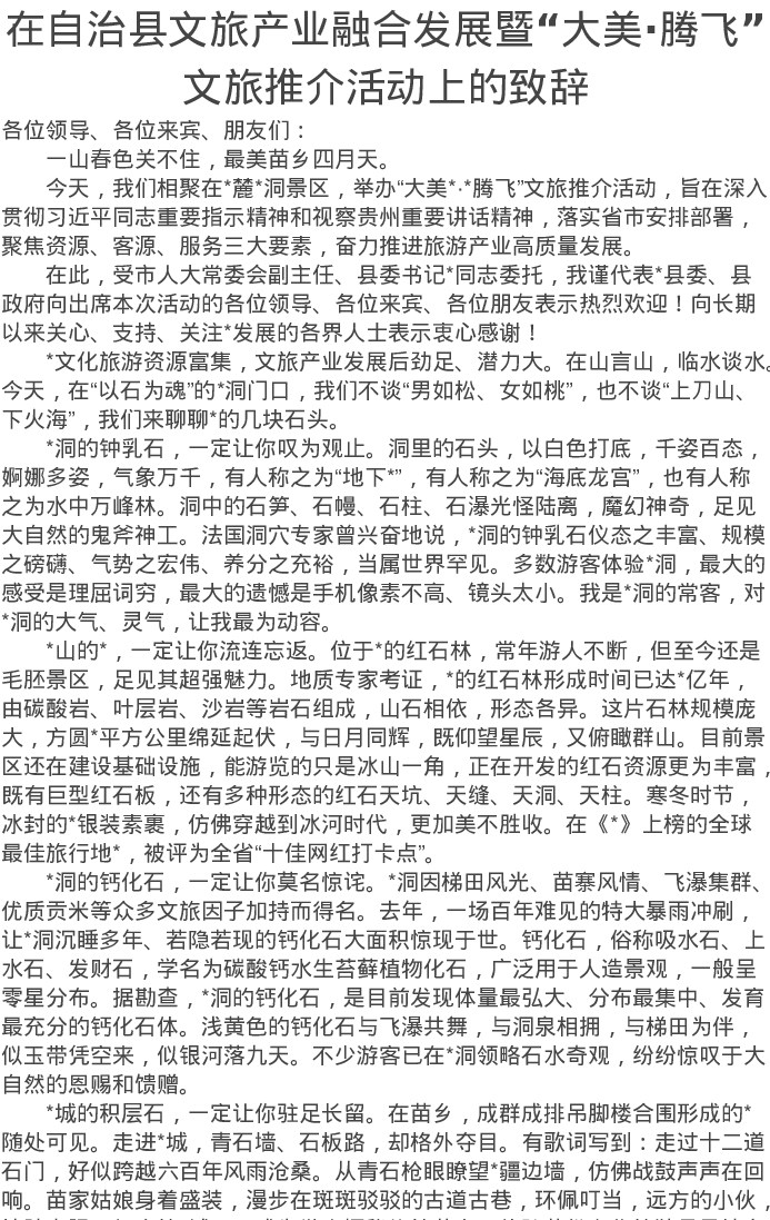 在自治县文旅产业融合发展暨“大美·腾飞”文旅推介活动上的致辞
