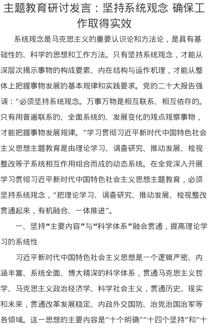 主题教育研讨发言坚持系统观念确保工作取得实效特色社会主义思想