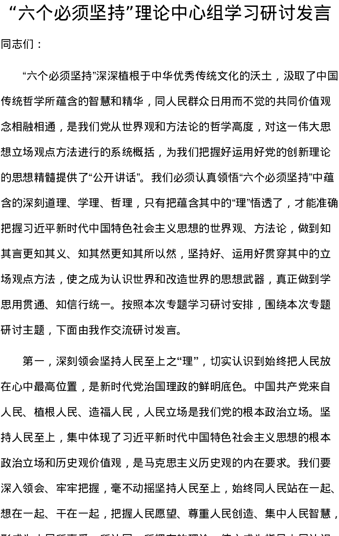 “六个必须坚持”理论中心组学习研讨发言