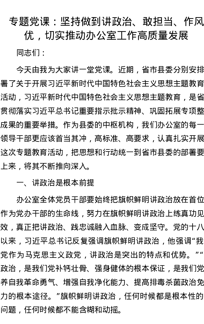 专题党课:坚持做到讲政治、敢担当、作风优,切实推动办公室工作高质量发展