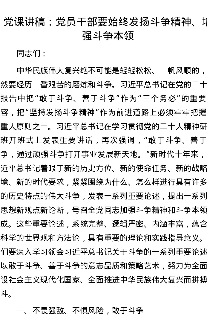 党课讲稿:党员干部要始终发扬斗争精神、增强斗争本领