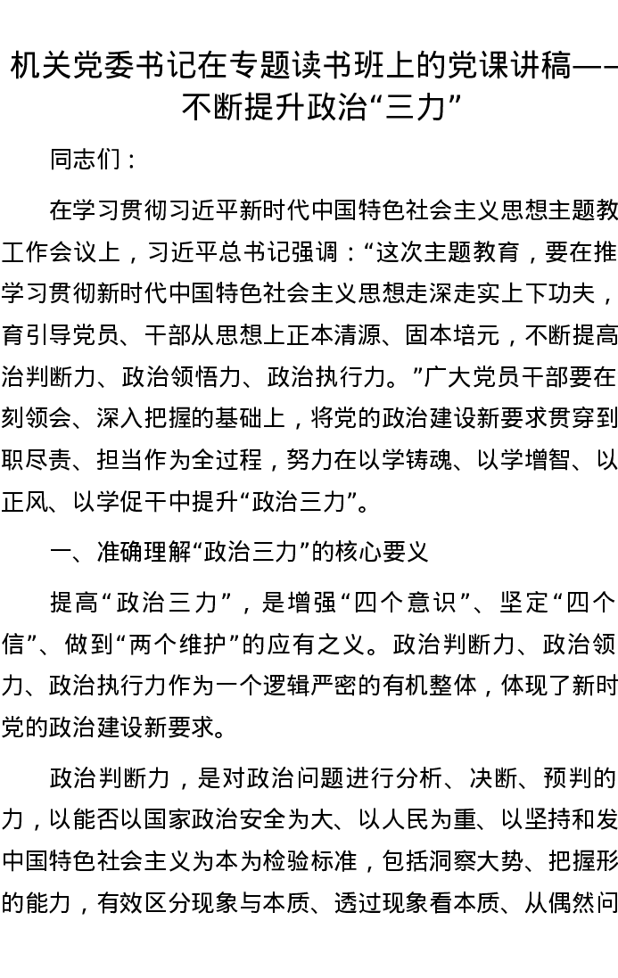 机关党委书记在专题读书班上的党课讲稿——不断提升政治“三力”