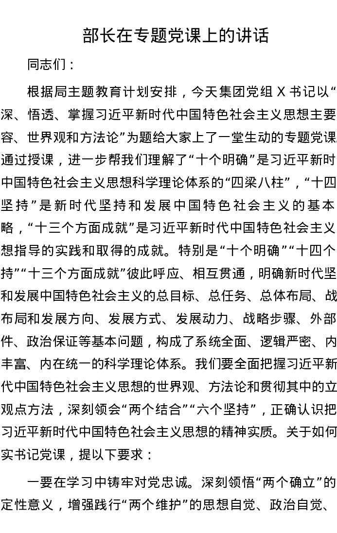 部长在专题党课上的讲话