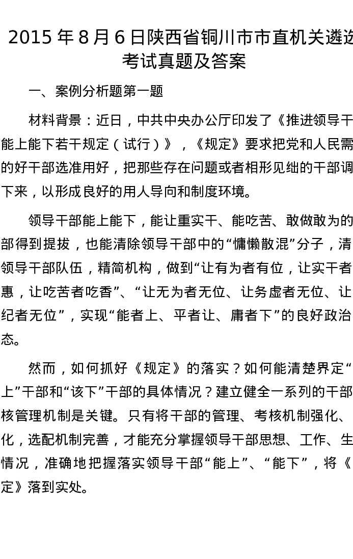 2015年8月6日陕西省铜川市市直机关遴选考试真题及答案