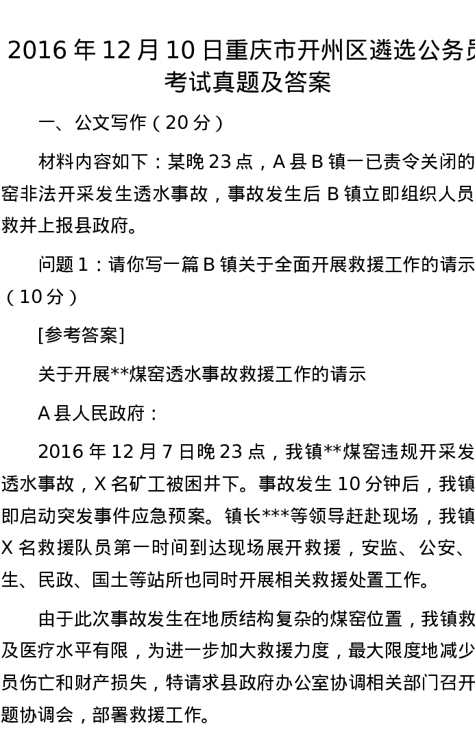 2016年12月10日重庆市开州区遴选公务员考试真题及答案