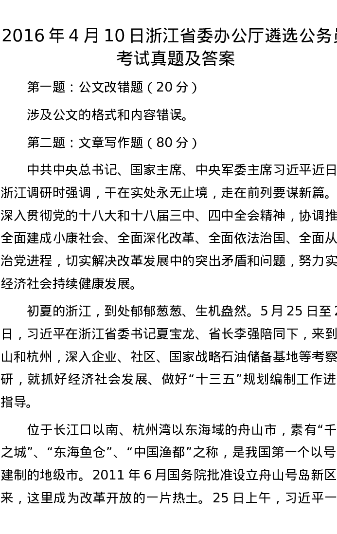 2016年4月10日浙江省委办公厅遴选公务员考试真题及答案