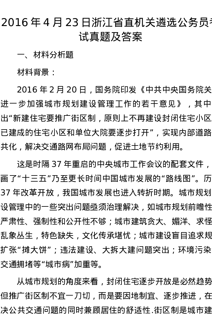 2016年4月23日浙江省直机关遴选公务员考试真题及答案