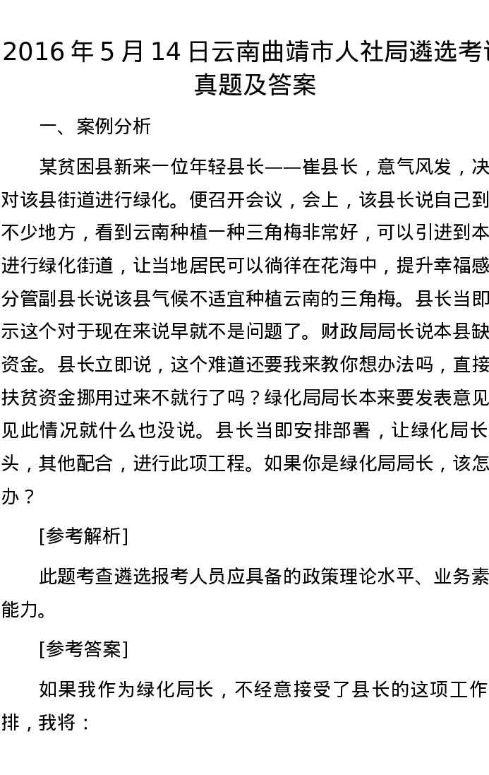 2016年5月14日云南曲靖市人社局遴选考试真题及答案
