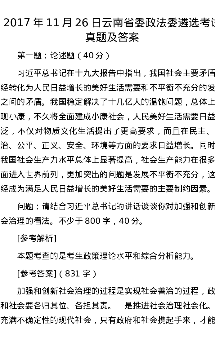 2017年11月26日云南省委政法委遴选考试真题及答案