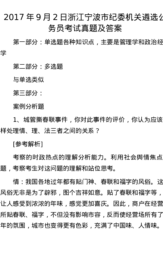 2017年9月2日浙江宁波市纪委机关遴选公务员考试真题及答案
