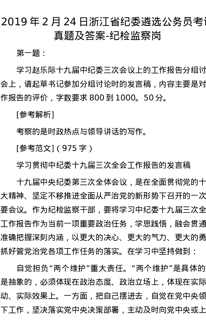 2019年2月24日浙江省纪委遴选公务员考试真题及答案-纪检监察岗