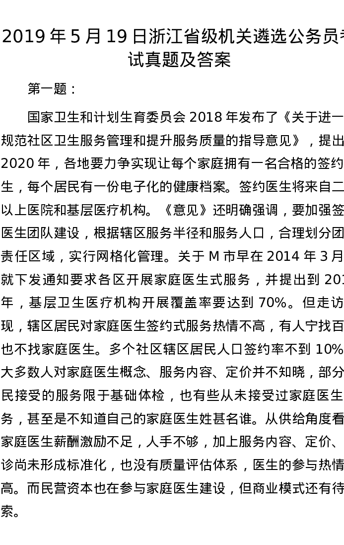 2019年5月19日浙江省级机关遴选公务员考试真题及答案