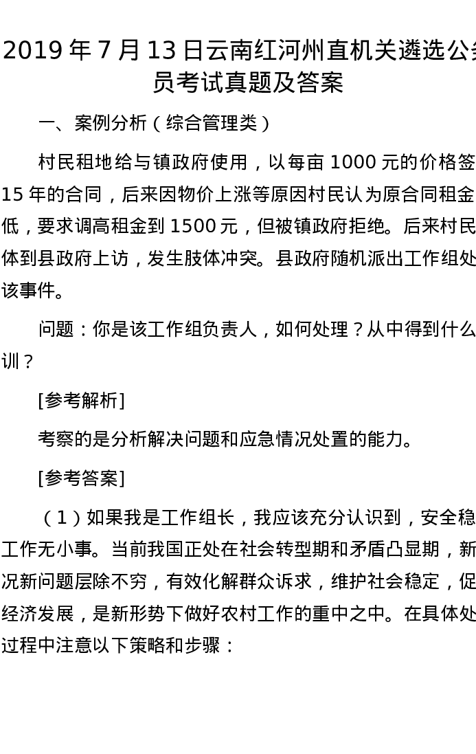 2019年7月13日云南红河州直机关遴选公务员考试真题及答案