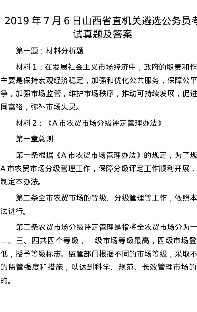 2019年7月6日山西省直机关遴选公务员考试真题及答案