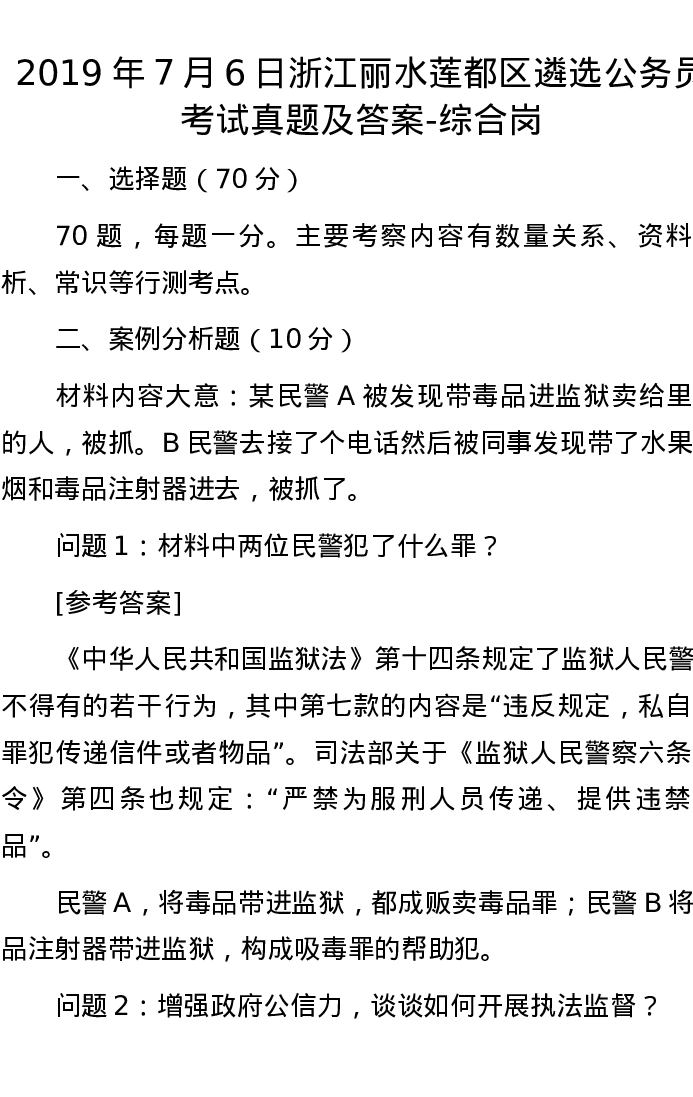 2019年7月6日浙江丽水莲都区遴选公务员考试真题及答案-综合岗