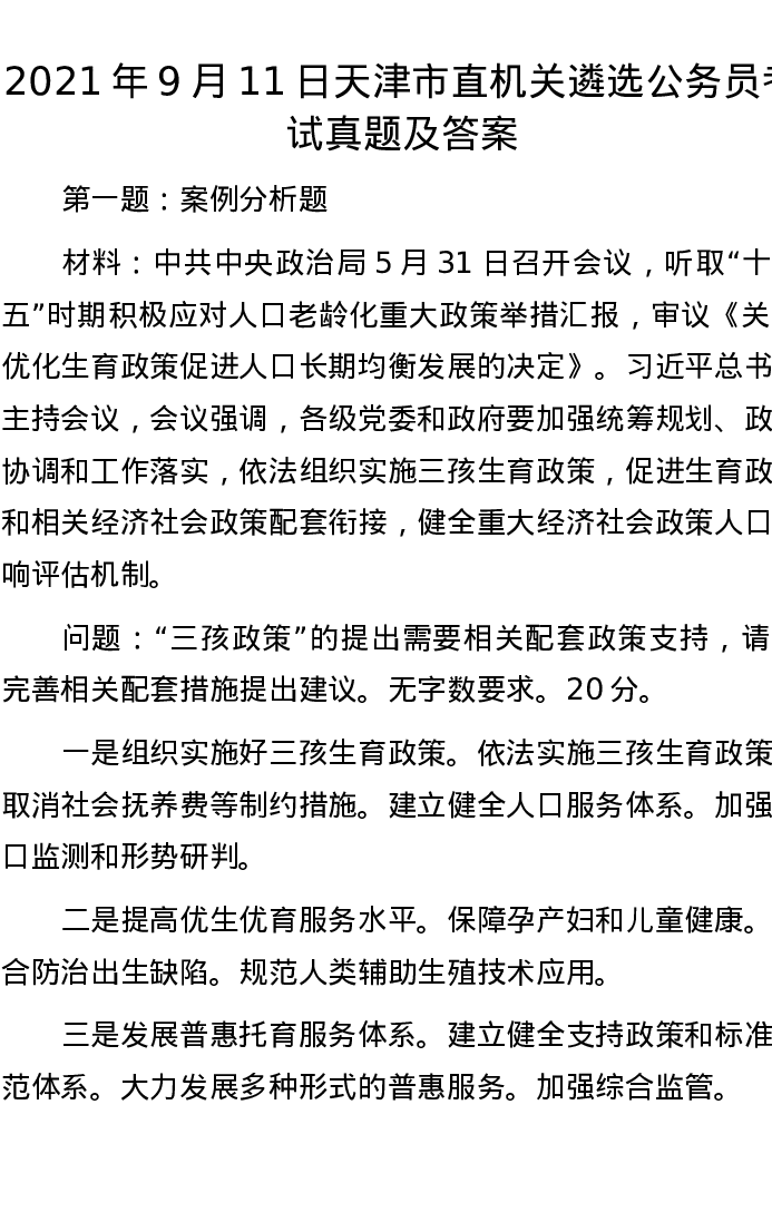2021年9月11日天津市直机关遴选公务员考试真题及答案