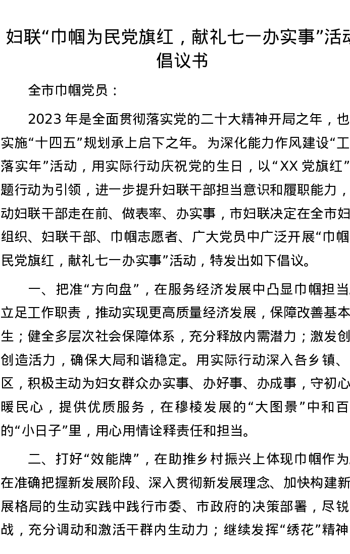妇联“巾帼为民党旗红,献礼七一办实事”活动倡议书