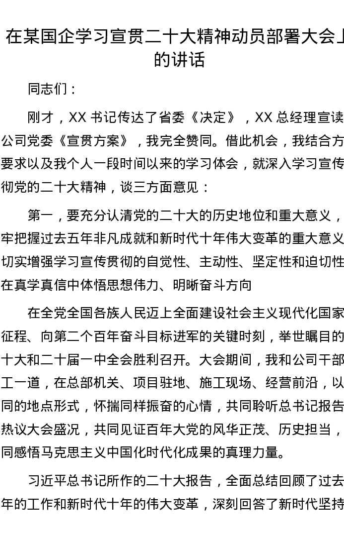 在某国企学习宣贯二十大精神动员部署大会上的讲话