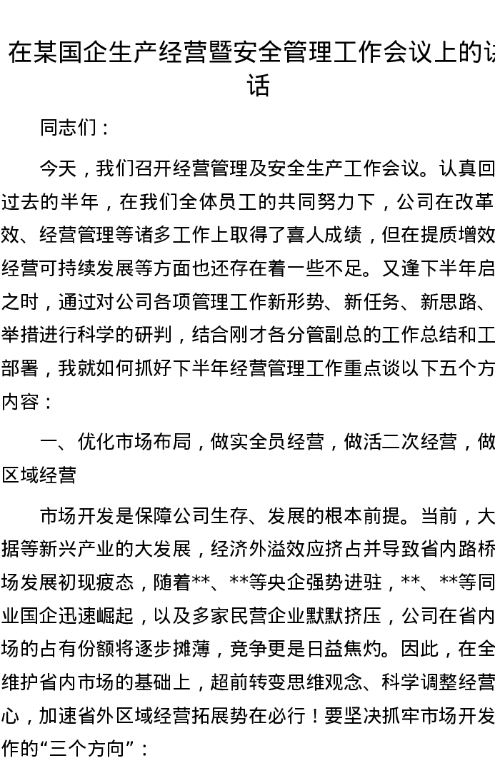 在某国企生产经营暨安全管理工作会议上的讲话