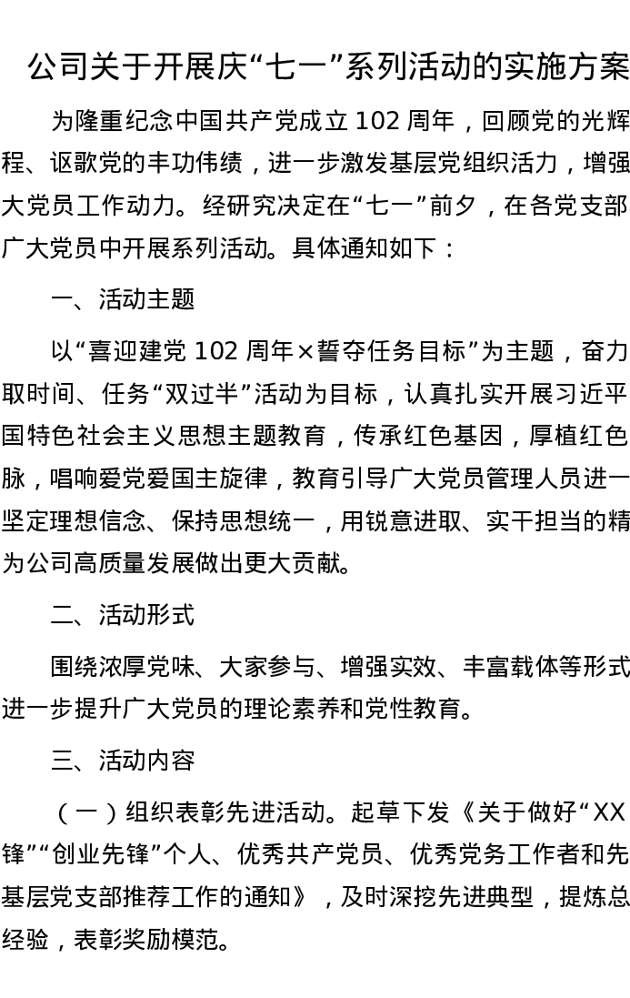 公司关于开展庆“七一”系列活动的实施方案