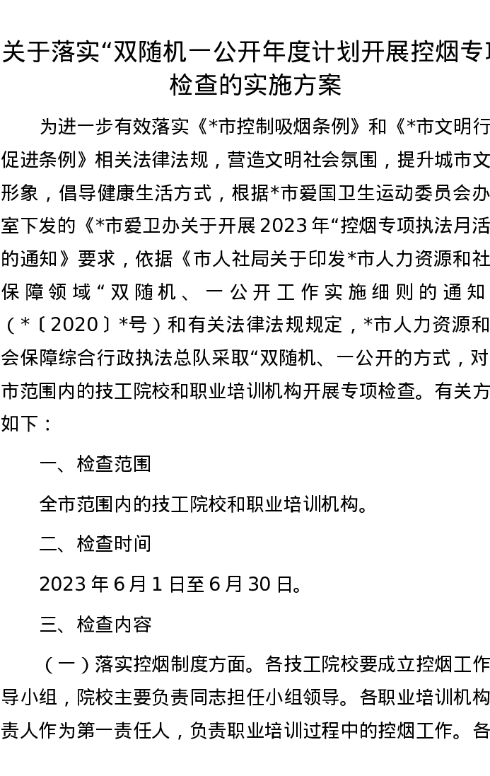 关于落实“双随机一公开年度计划开展控烟专项检查的实施方案