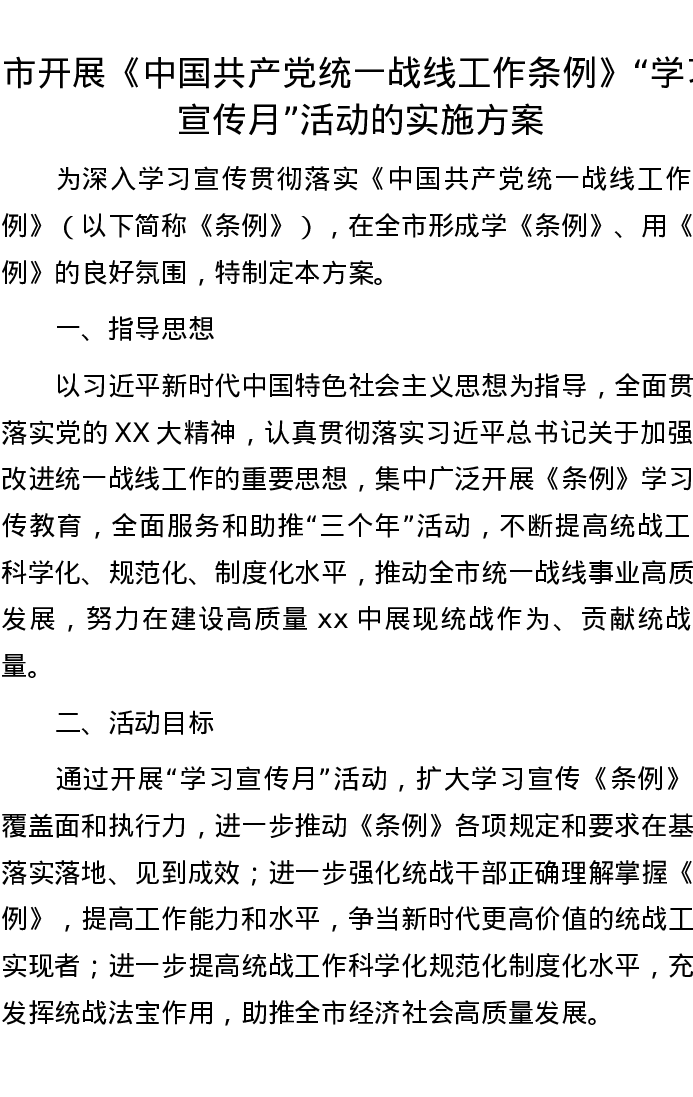 市开展《中国共产党统一战线工作条例》“学习宣传月”活动的实施方案