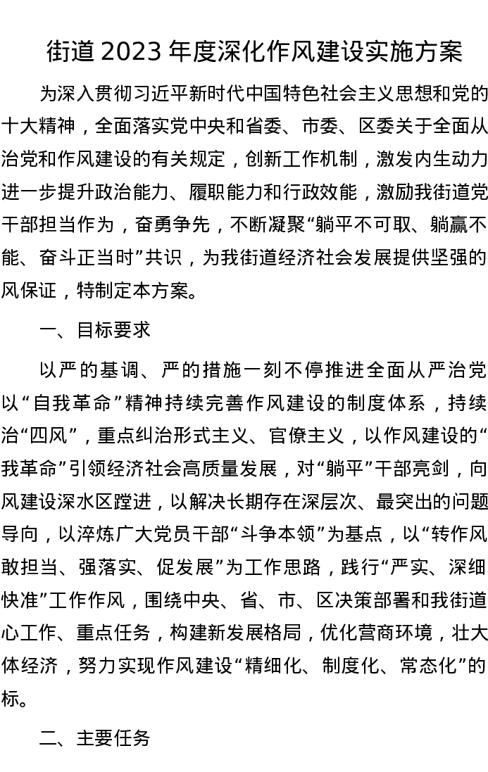 街道2023年度深化作风建设实施方案