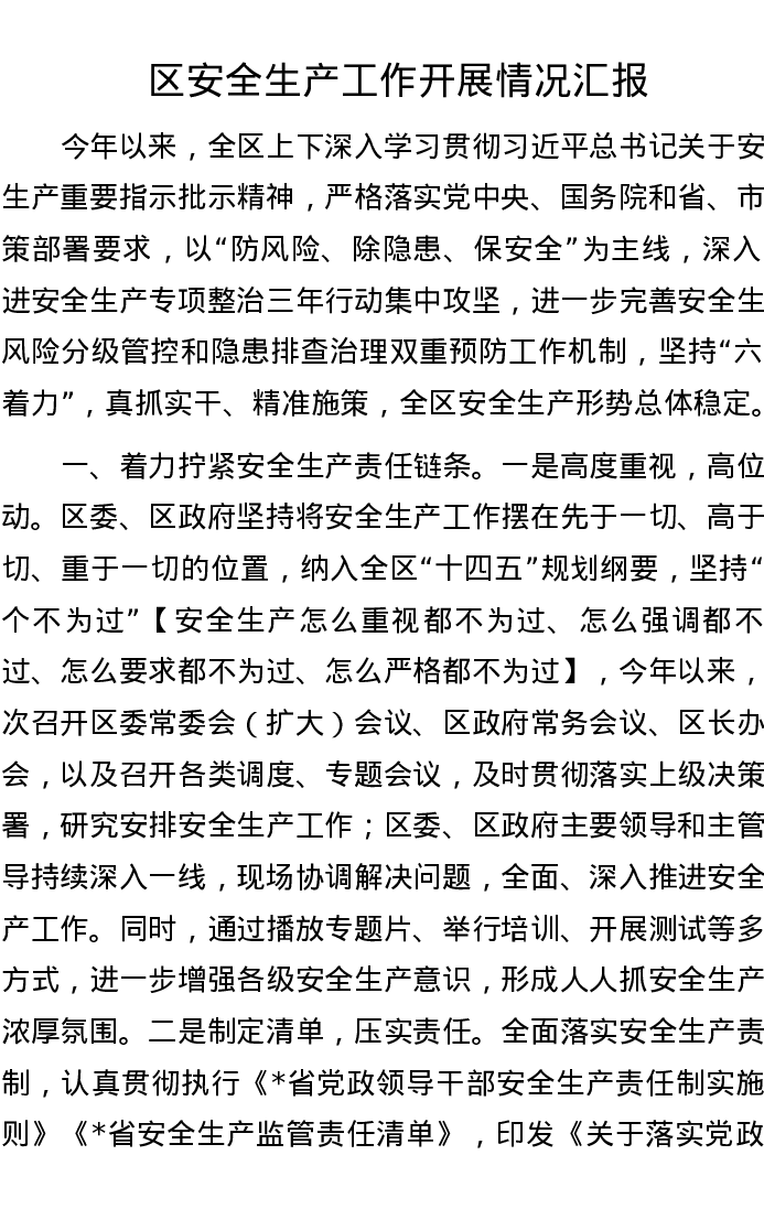 区安全生产工作开展情况汇报