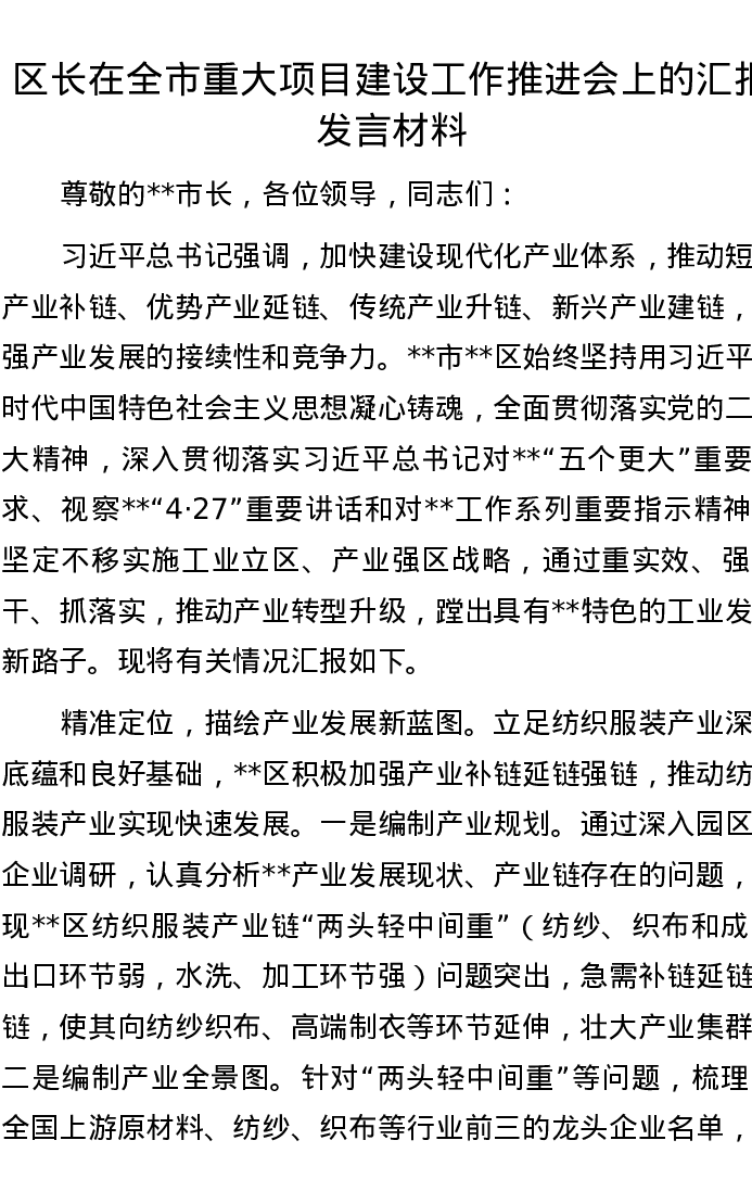 区长在全市重大项目建设工作推进会上的汇报发言材料