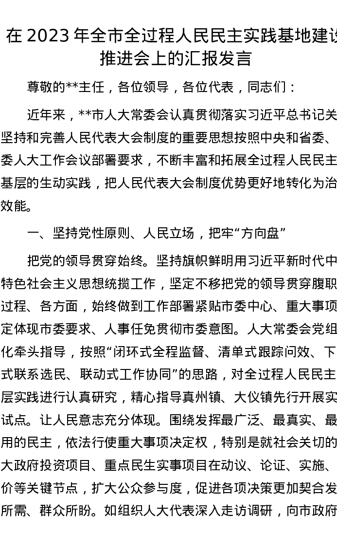 在2023年全市全过程人民民主实践基地建设推进会上的汇报发言