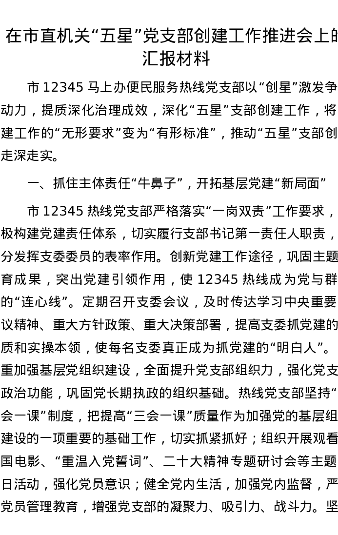 在市直机关“五星”党支部创建工作推进会上的汇报材料