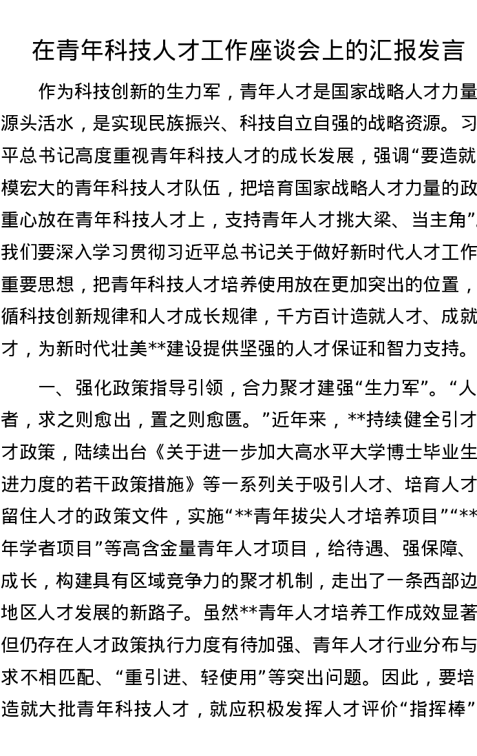 在青年科技人才工作座谈会上的汇报发言