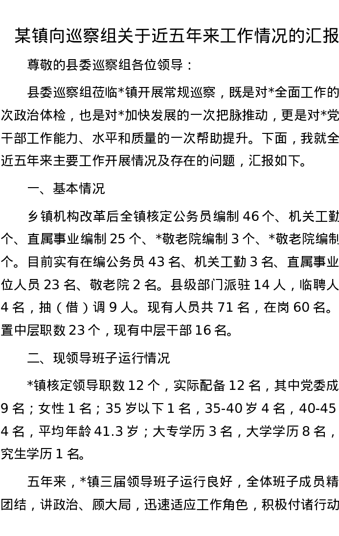 某镇向巡察组关于近五年来工作情况的汇报