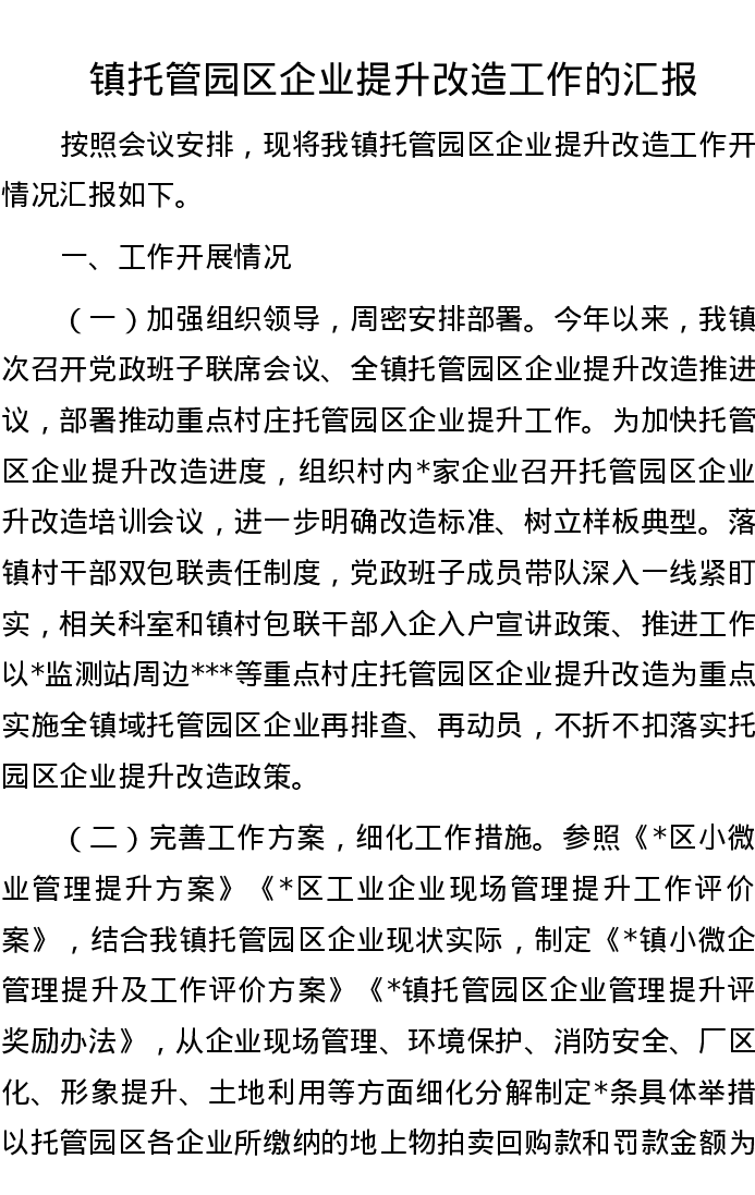 镇托管园区企业提升改造工作的汇报