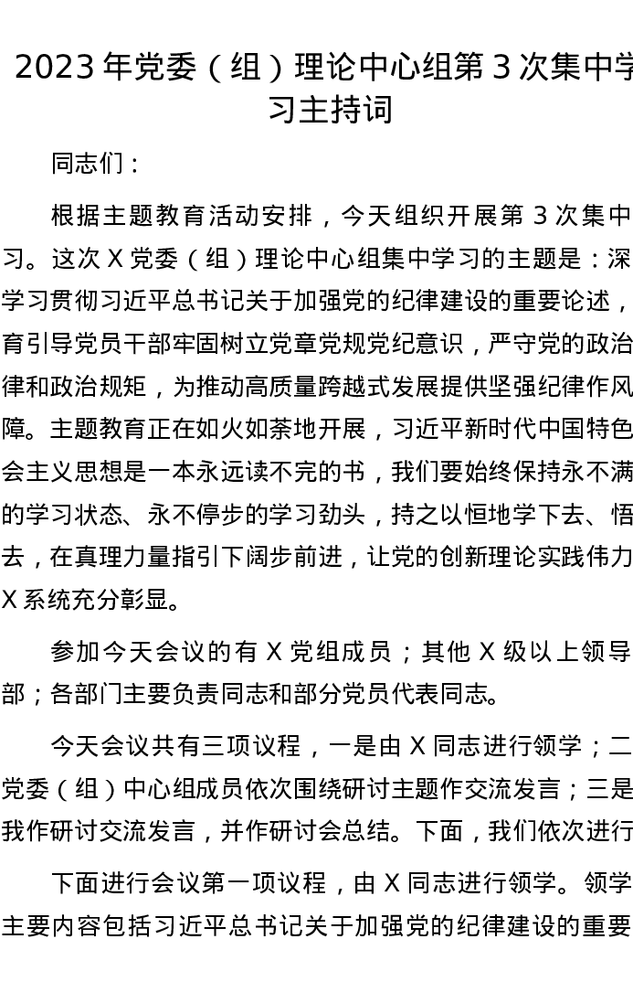 2023年党委(组)理论中心组第3次集中学习主持词