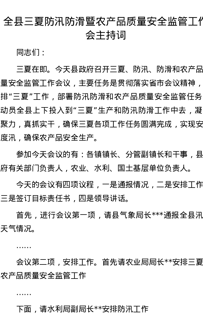 全县三夏防汛防滑暨农产品质量安全监管工作会主持词