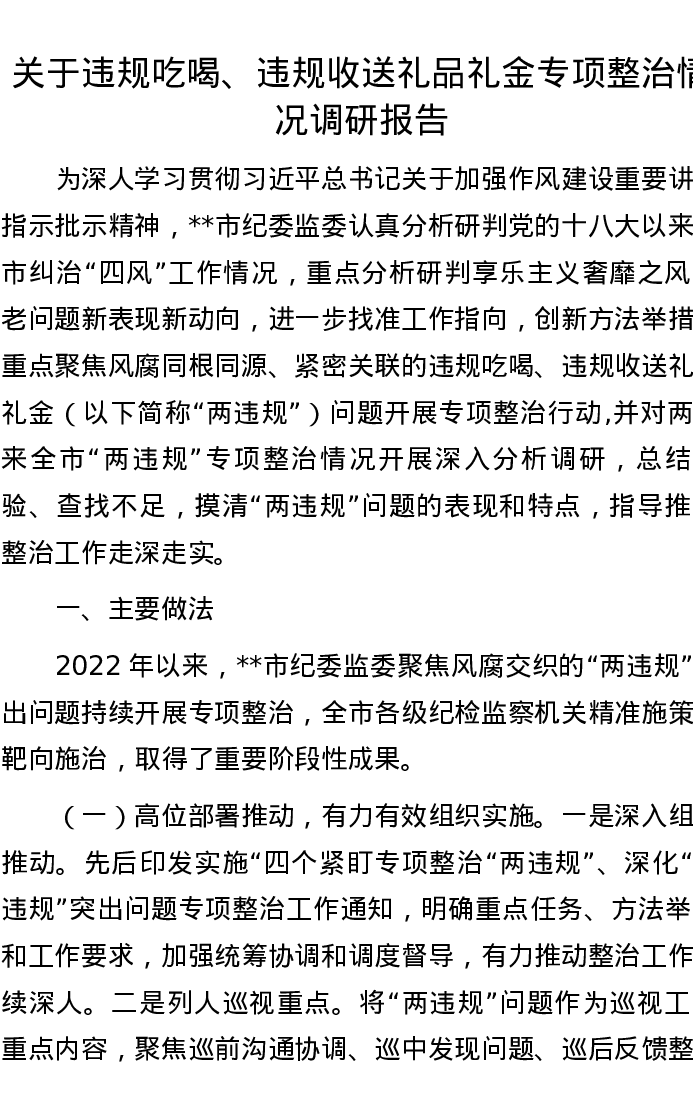 关于违规吃喝、违规收送礼品礼金专项整治情况调研报告