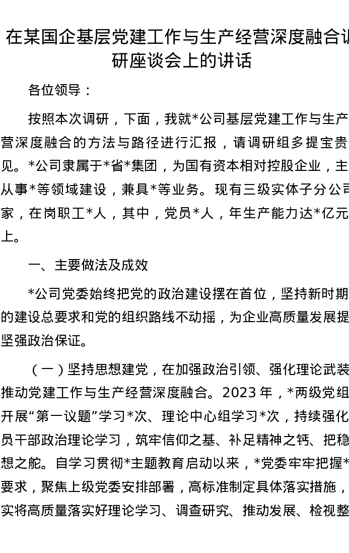 在某国企基层党建工作与生产经营深度融合调研座谈会上的讲话